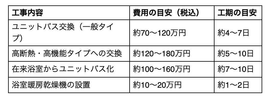浴室リフォームの費用は、工事内容や浴室の広さによって異なります。 以下は一般的な相場の目安です。